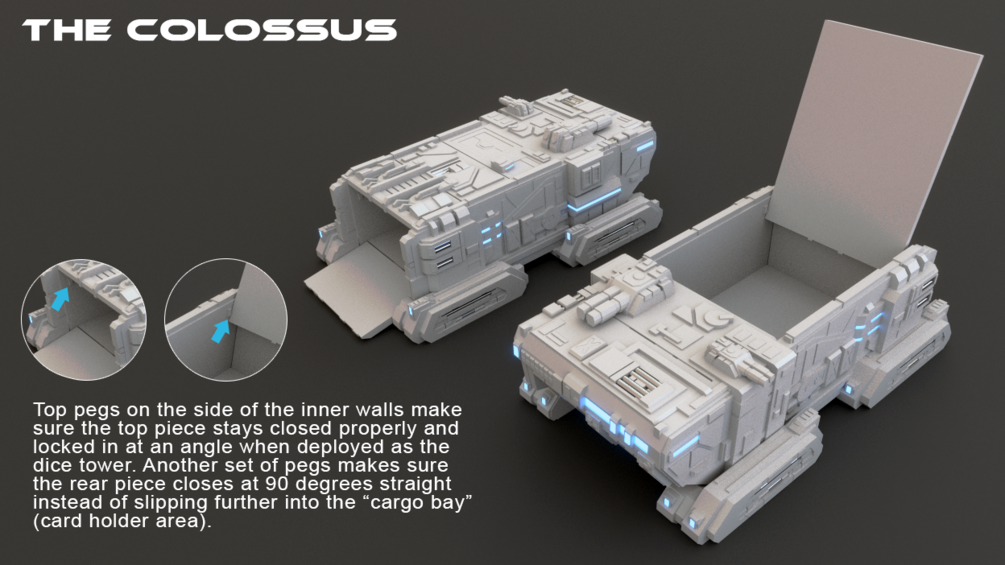 One day I thought to myself, why not combine what I have been doing and make a dice tower as I have not seen any 3d printable scifi vehicle miniature that also acts as a dice tower AND also a card holder.